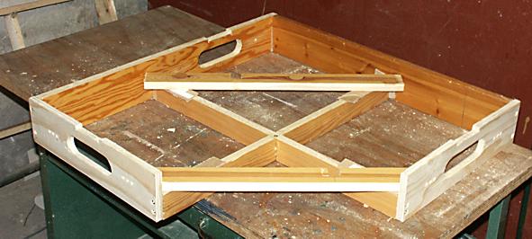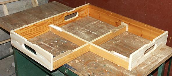 Ett par lister för att höja nivån för plattan nedan som består av en gammal skåphylla.