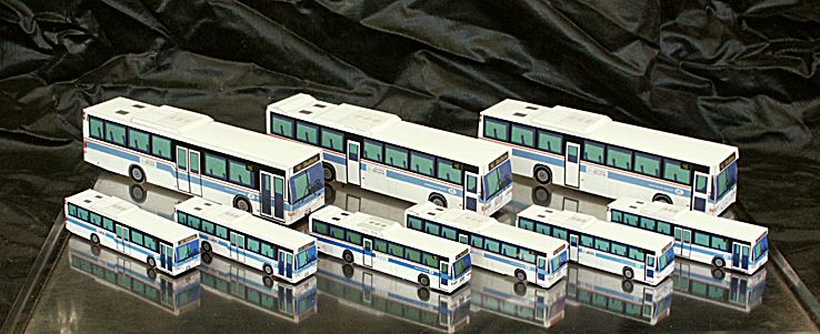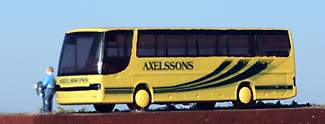 |  | Tre olika varianter av Volvo B10M som rullar just nu på linjen mellan Västerås och Skultuna, på bilden både i H0 och i N | |||