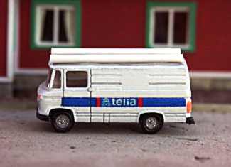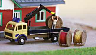 lastbil från Wiking Här lastar man av rullar med tomrör för den landsomfattande bredbandsutbyggnaden. Lyftarmen är byggd av styrenplast, strips och remsor. Flaket skall senare korrigeras så att armen hamnar framför flaket. | |||
