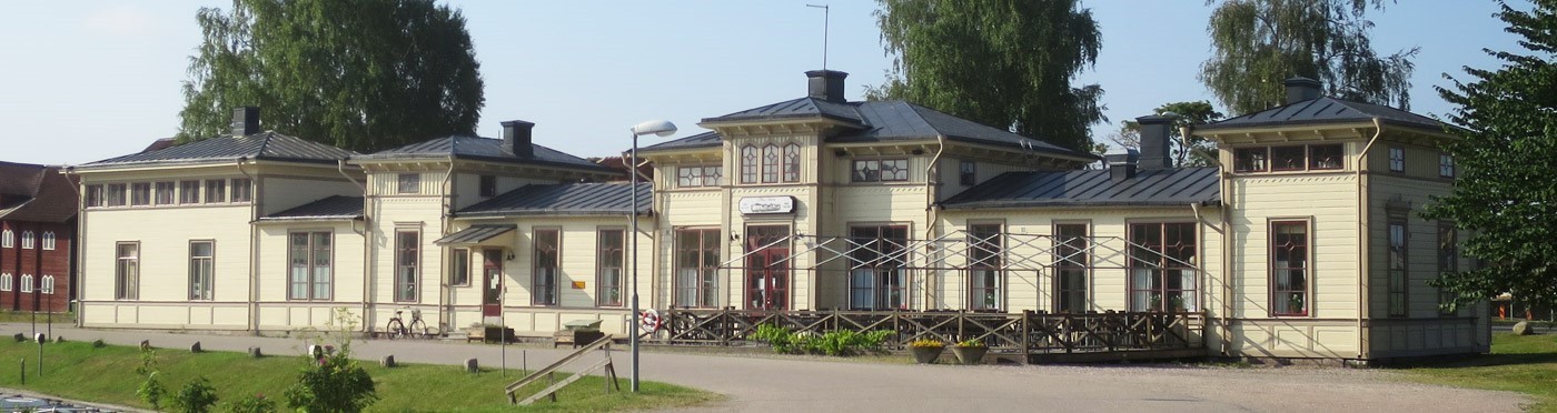 Stationshuset sommaren 2016 - Med restaurang Athos i delarna till höger.Stationen byggdes under andra halvan av 1860-talet för Köping-Uttersbergs Järnväg. Under 1940-talet kompletterades stationsdelen med ett hamnkontor i de två tillbyggda delarna på vänstra sidan.