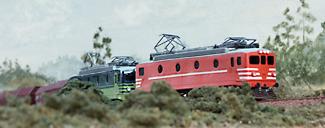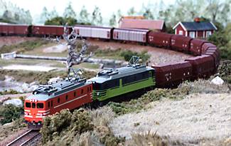 ![]() Två modellbilder från kanalmodulen. Multipelkopplade Ma framför ett långt godståg. |