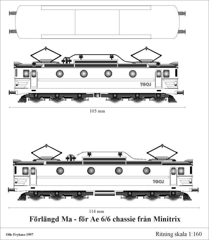 Den översta ritningen visar orginalstorleken på loket Den understa visar det förlängda loket.