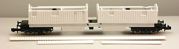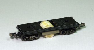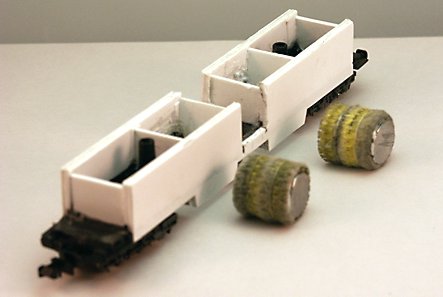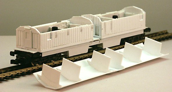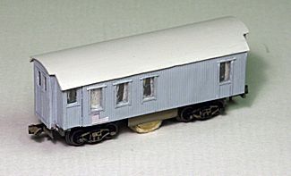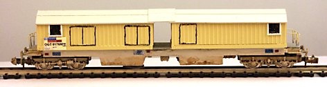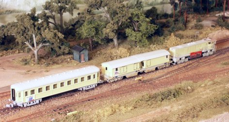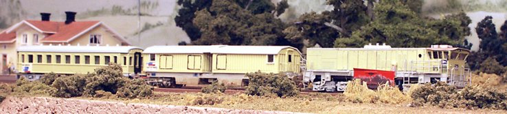 Banverkets rälsrengöringståg Används för rengöring av rälsen på modellanläggningen. Här uppställt på Skultuna station en dryg månad senare(18 sept 2004) Tåget är sammansatt av Tb-loket DLL 3108, en rälsrengöringsvagn och en manskapsvagn av lite äldre snitt. |