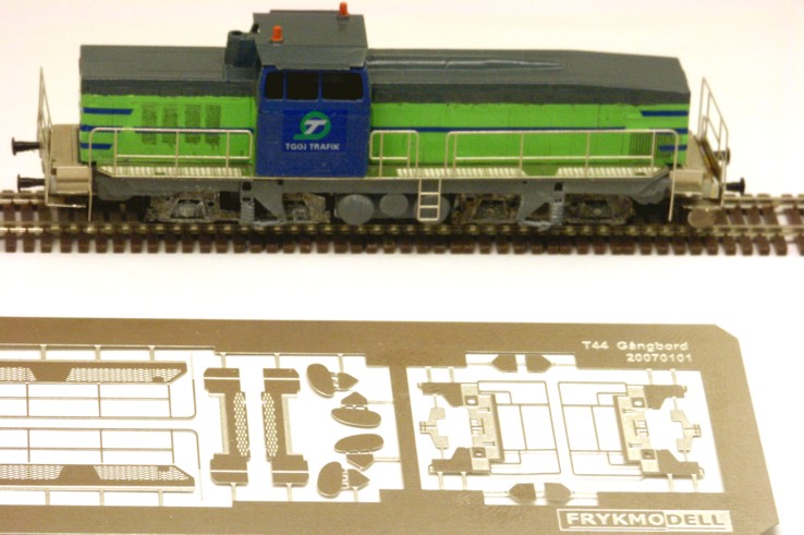 Modell 2 Modellen avbildar TGOJ:s T44 278 Kåpa från Nmodell/Modellproduktion. Underredet är nu modifierat så att det baseras på Rocos orginalunderrede med några modifieringar. Detta för att få bättre gångegenskaper. Modellen är sedan "superdetaljerad" med egna etsade gångbord, räcken och smådetaljer. |