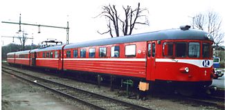Motorvagn X20 Tillverkades av Hilding Carlssons verkstäder för TGOJ. De hade ursprungligen littera Yoa104 och var målade i TGOJ:s gul/gröna färgsättning. Gul-grön ovan med olivgrönt under fönsterna. Motorvagnarna målades senare om i TGOJ:s färgsättning enligt bilden. Under 1990-talet gick vagnarna i trafik i första hand på sträckorna i Bergslagen åt Västmanlands lokaltrafik. Under den tiden målades denna vagn om i VL.s färger, vit med blå och röd rand vid midjan. Denna vagn går fortfarande år 2003 i trafik som insatståg Stockholmsregionen. |