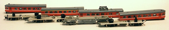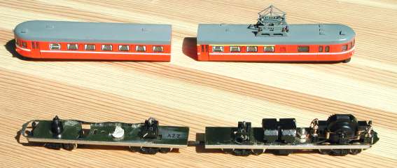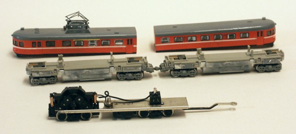 att bara bromsarna finns kvar och hjulsidorna syns som på förebilden. Chassiet kapas till rätt längd och nya hål för de bakre boggierna borras. Extra tyngder behövs på drivdelen för att öka dragkraften utan att tåget slirar. Strömupptagning sker för ena polen på drivdelens bakre boggie, för den andra polen från båda boggierna på släpvagnen. |