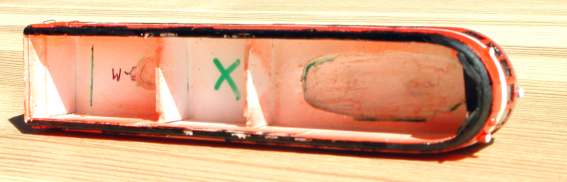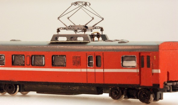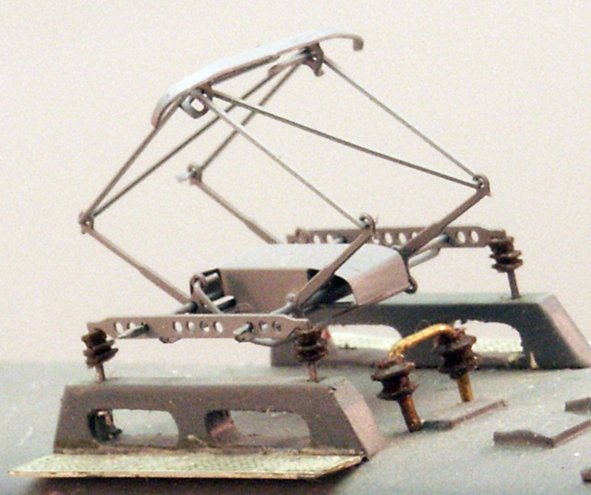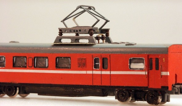 Kåpa Sidorna är byggda i styrenplast i två skikt. Det inre skiktet i 0.7 mm värmdes i vatten och böjdes runt en form i trä. Ett par tvärväggar av 1mm plast behövs för att karossen skall hålla formen. Det yttre skiktet 0,25 mm gjordes färdigt med utskurna fönster innan det limmades fast. Taket består av skiktlimmade styrenplastskivor som filats till rätt rundning. Strömavtagarna är gjorda av styrenplaststavar. |