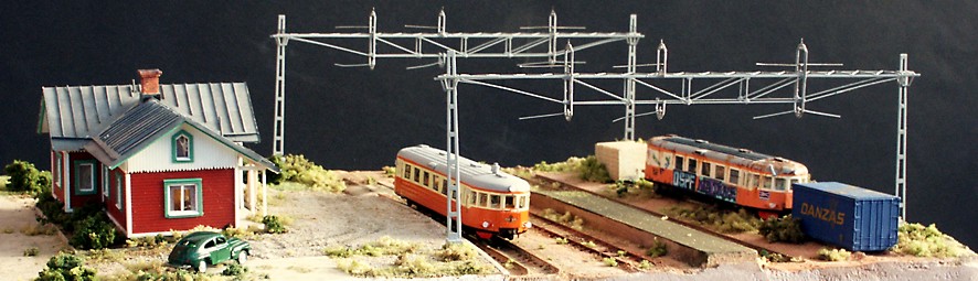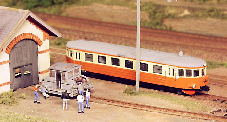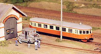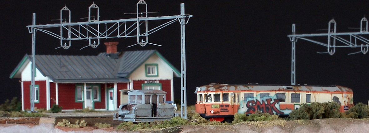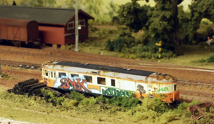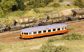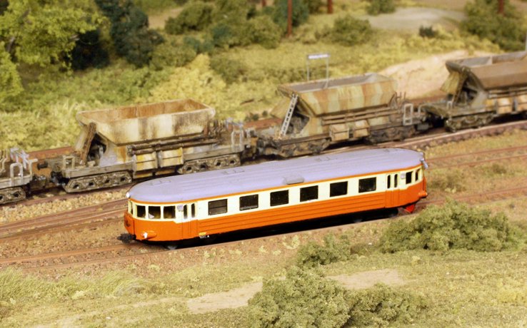 Till vänster passerar ett ballasttåg den uppställda rälsbussen. |