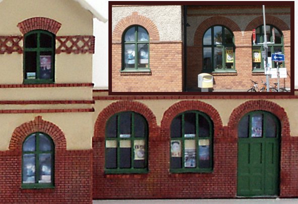 - Stationsnamn, del av tegelväggen, tegeldekor, fönster och