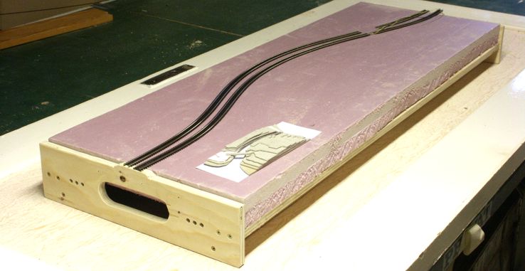 Ovanpå hyllan görs rälsbädd och mark av ett par överblivna takplattor