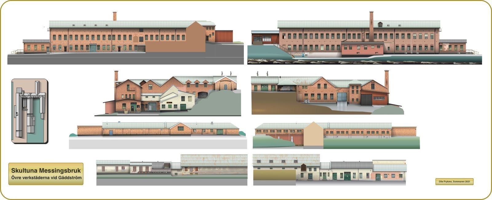 En relativt skalenlig modell av tegelbyggnaderna vid de övre verkstäderna vid Skultuna bruk.